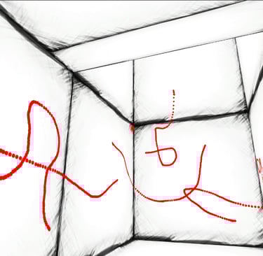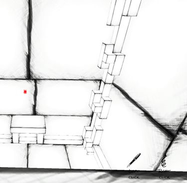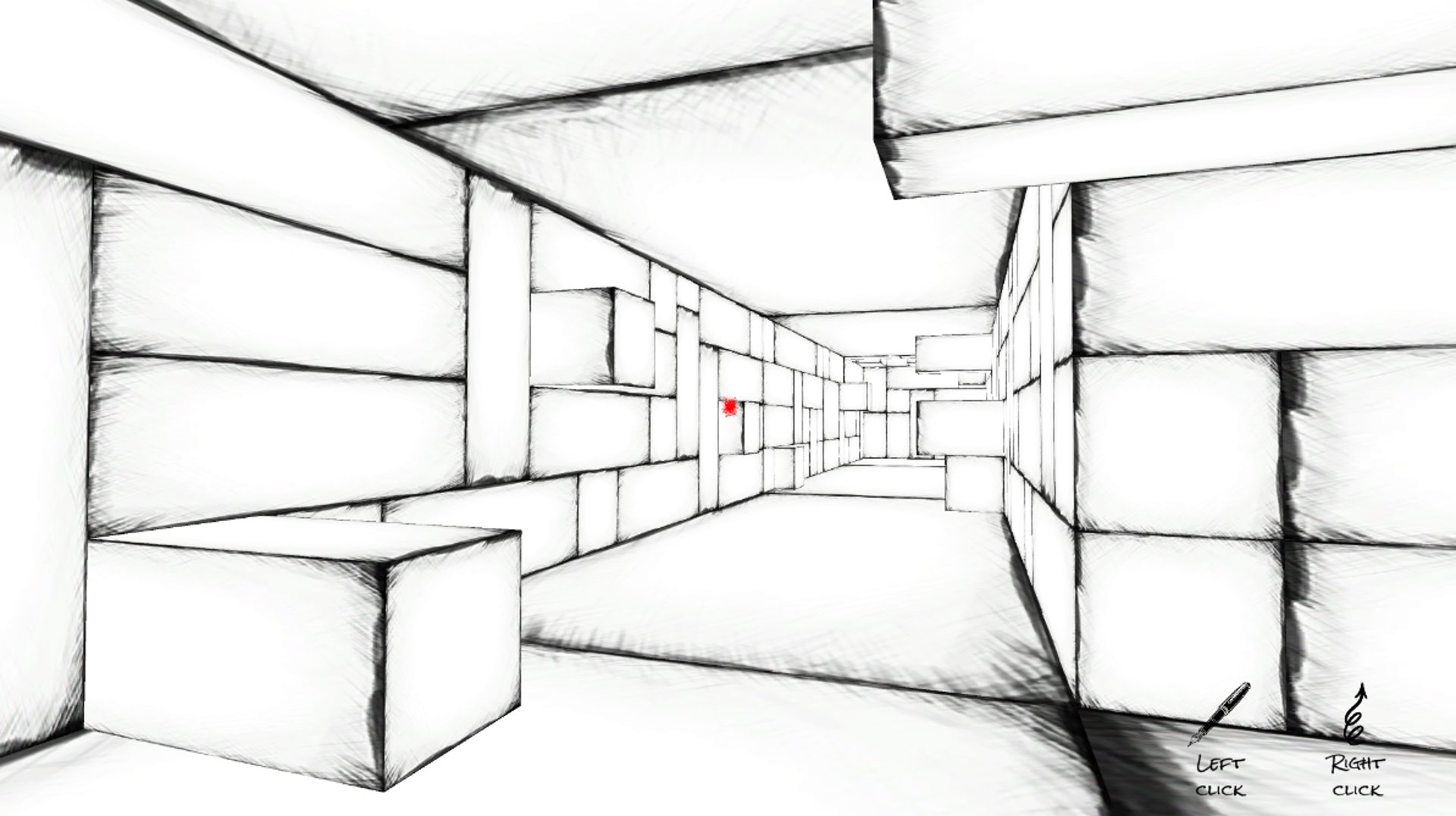 Strokes of Madness est un jeu de labyrinthe où le joueur doit trouver la sortie d’un labyrinthe non linéaire. Pour s’aider, il ne dispose que de deux interactions. Avec le clic gauche, il peut dessiner sur toutes les surfaces, comme il le souhaite. Afin de se repérer dans ce labyrinthe où tout se ressemble, il devra se servir de cette capacité pour cartographier l’environnement et marquer son passage. La seconde interaction permet au joueur de changer son point de gravité en regardant un mur et en maintenant le clic droit. Grâce à ces deux interactions, il a un contrôle total sur son exploration : le plafond peut devenir le sol, et il peut annoter librement chaque surface.